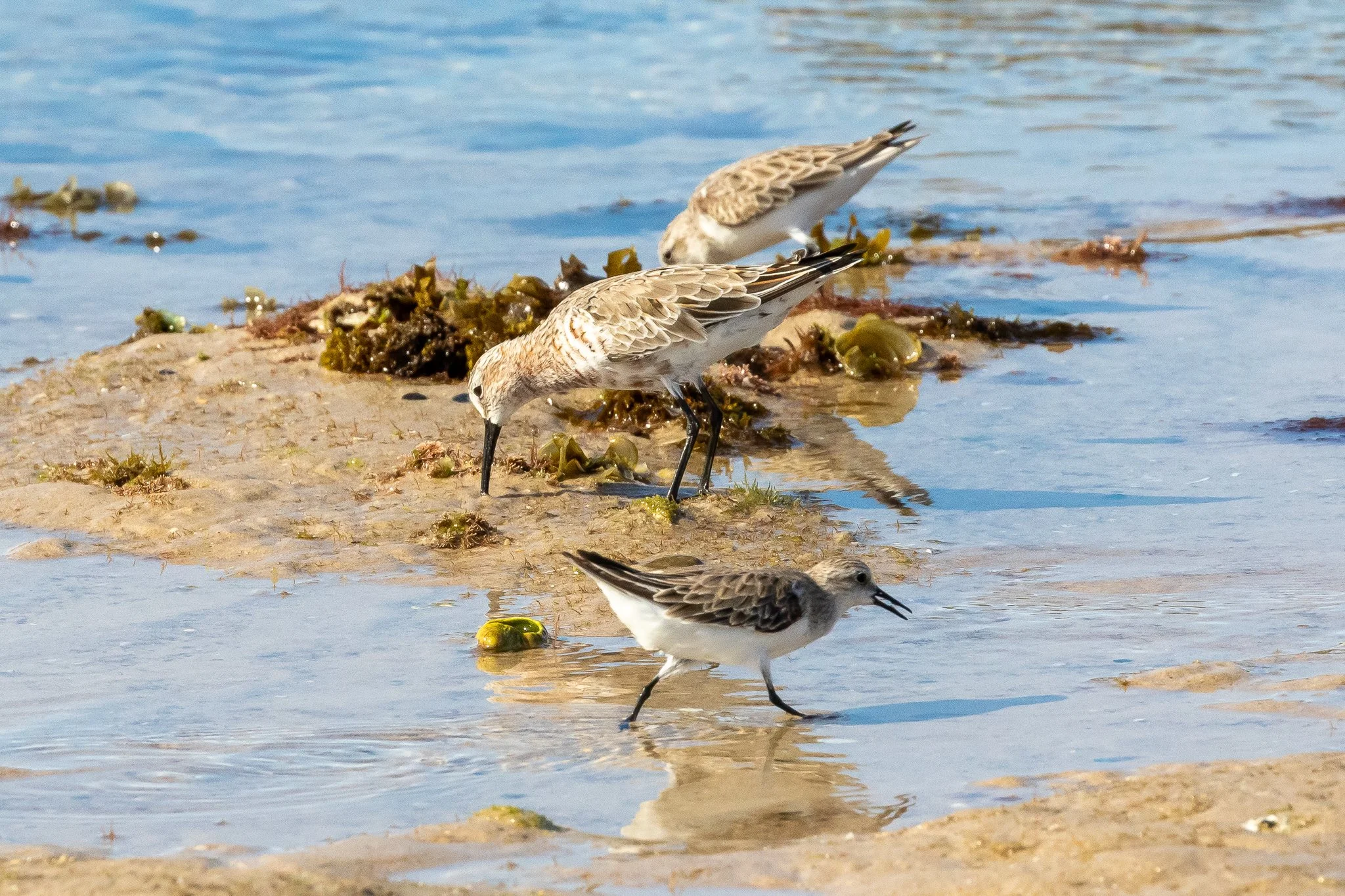 Red-necked Stints feeding while a Curlew Sandpiper probes for worms in a rock-pool. The Curlew is showing a hint of colour as departure looms. Nearby, Ruddy Turnstones were feeding.