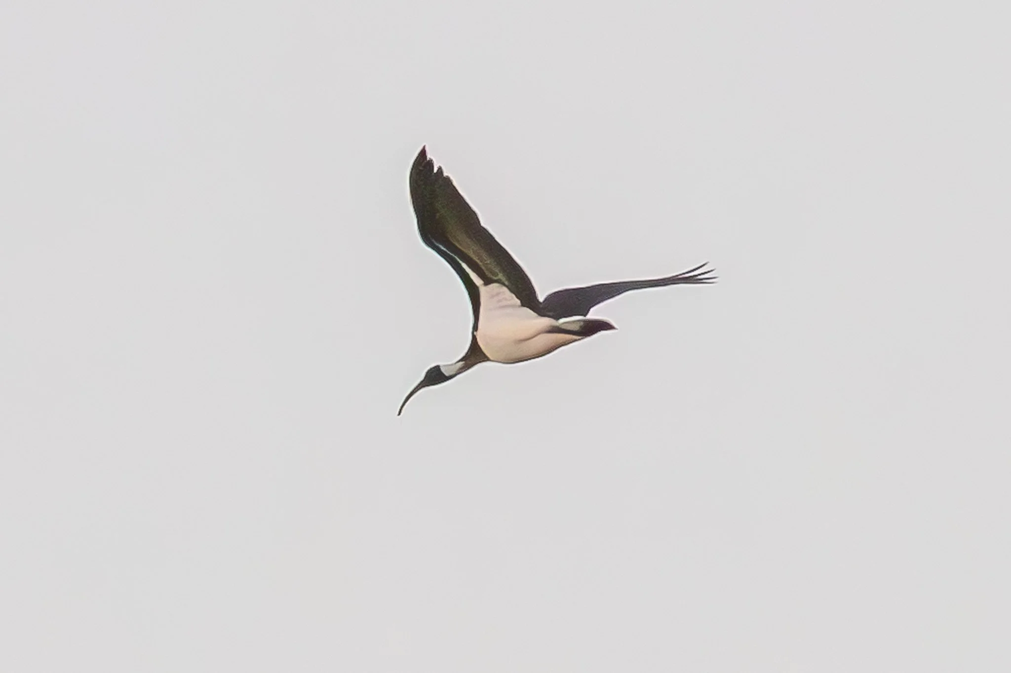 This Straw-necked Ibis was a flyover. The Straw-necked Ibis rarely use the wetlands but are often present in the surrounding farm lands.