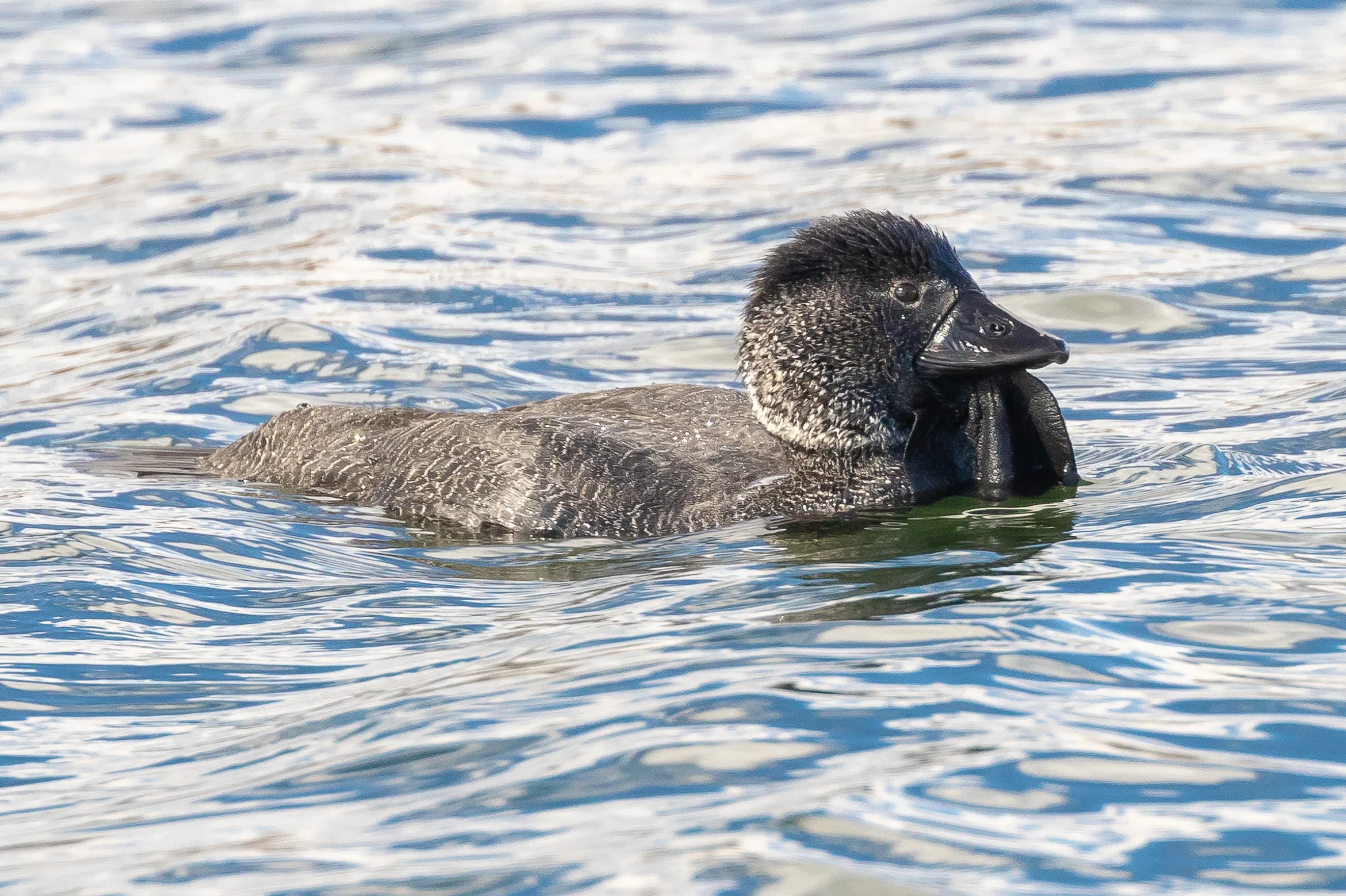 Musk Ducks (65 cm) are another stiff-tailed duck found across southern Australia. The male Musk Duck has a characteristic lobe, seen here. They dive for small animals and insects.