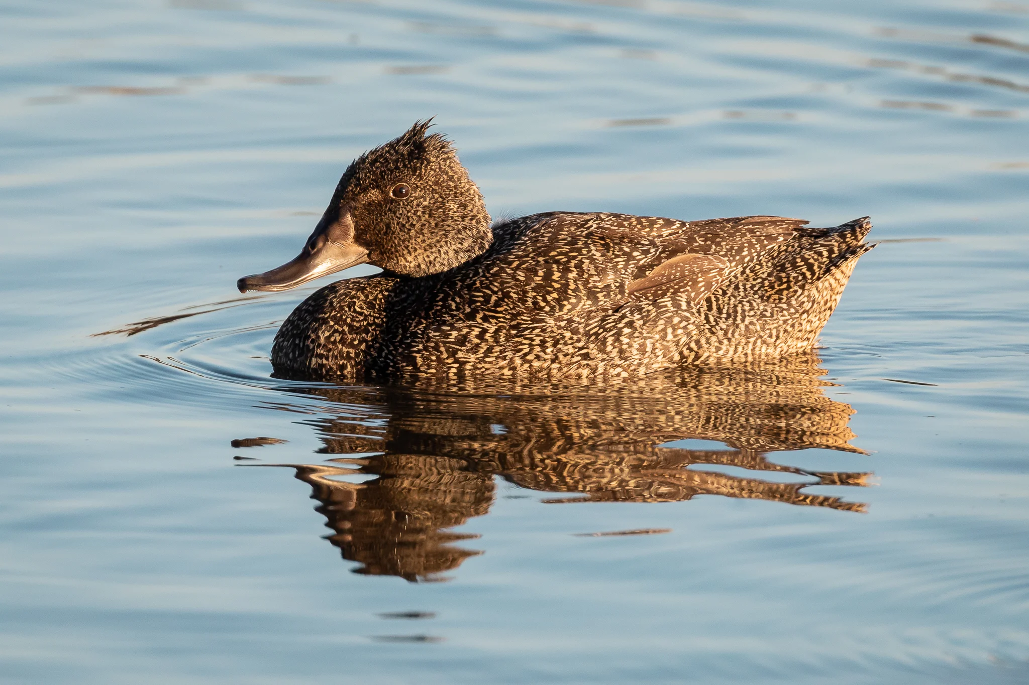 The Freckled Duck (59 cm) is seen in the swamps and creeks of mid-Victoria, mid-New South Wales and south western Australia, feeding on vegetation, algae and seeds. A uniquely Australian species.