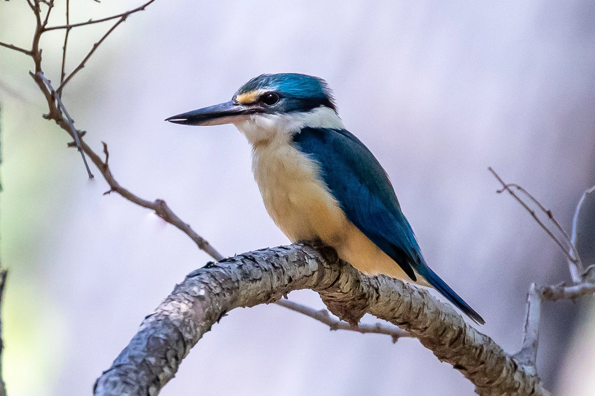 The Sacred Kingfisher (23 cm) inhabits most coastal and inland Australia except the dry deserts of the west, and migrates south to breed. Hunts on dry land for small reptiles and insects.